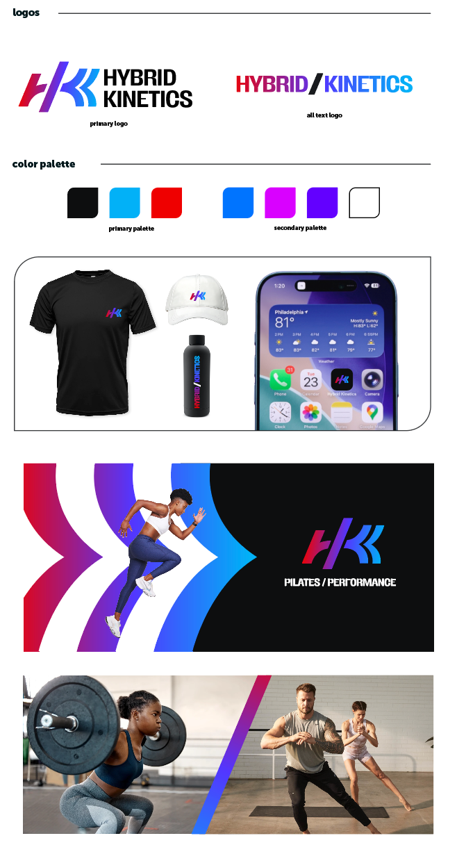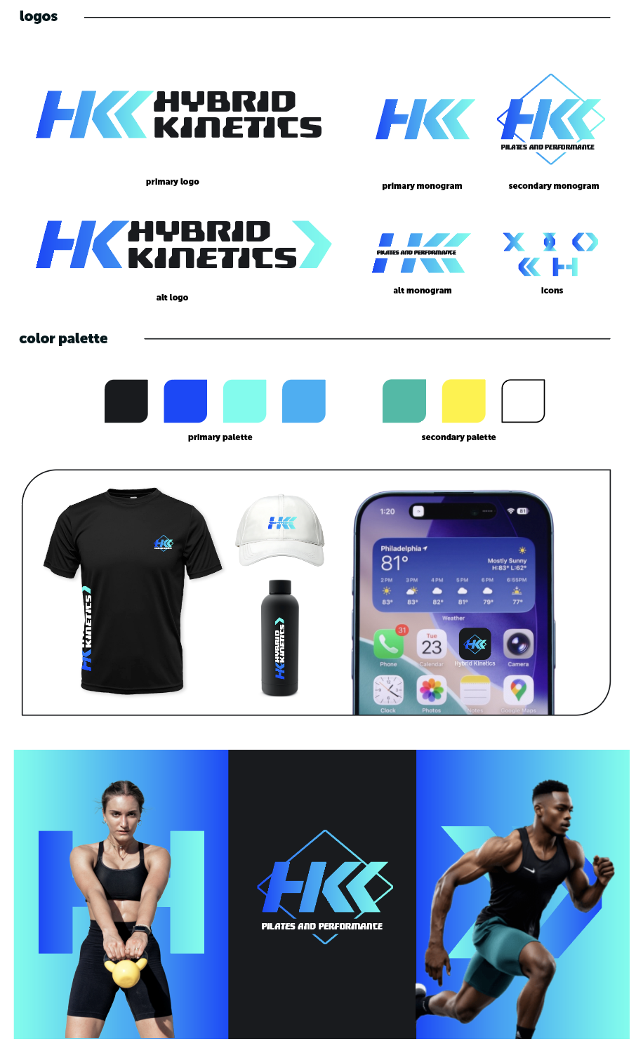 Hybrid Kinetics is a fitness app split between “Pilates” and “Performance.” Because the focus of the app was to prioritize both types of fitness, I wanted a brand that reflected just that. A logo that had two halves- divided, yet united. Colors that reflected the spectrum between the two halves. Elements that could be pulled out to reflect movement.