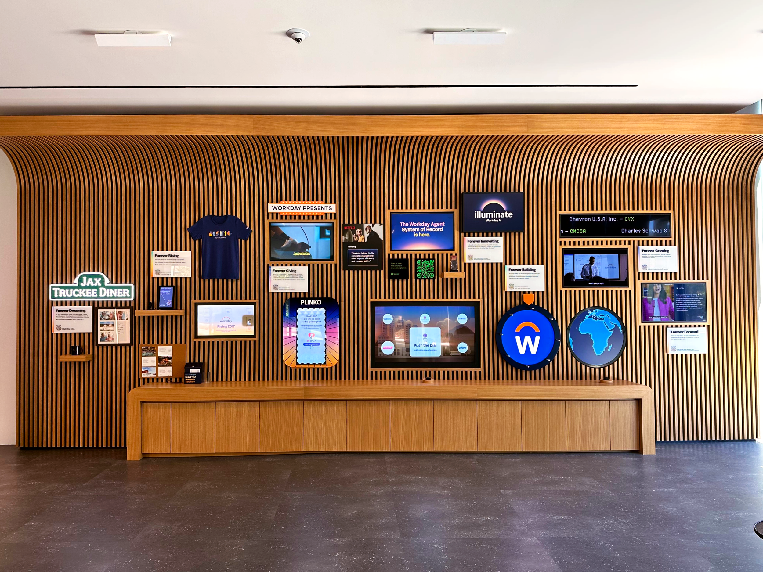 The Innovation Gallery Wall is the heart of the CXC. the Innovation Gallery Wall brings to mind a multi-media, interactive, museum where guests can dive deeper into leading consumer brands, better understand Workday’s history and culture, and appreciate the spirit of mutual innovation and success behind these relationships.